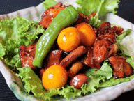 レバーやハツ、砂肝、キンカンを醤油と砂糖だけで甘辛く照り煮した鳥もつ煮は、ご飯にもお酒にもピッタリ!! そばとセットになった定食も人気です。一度食べるとやみつきです。